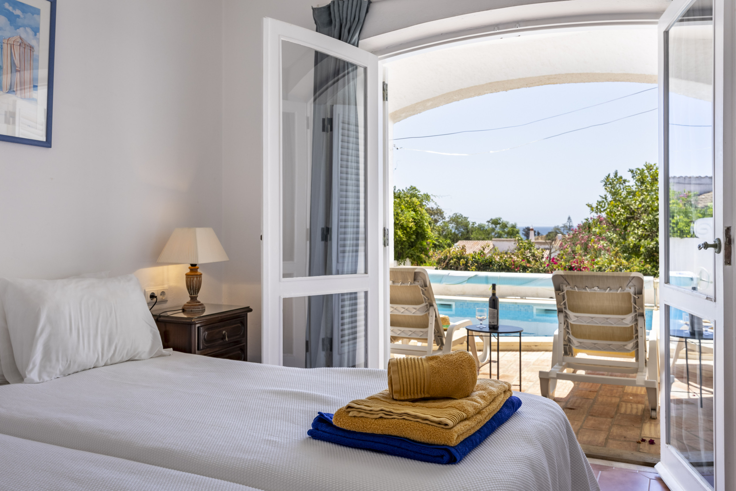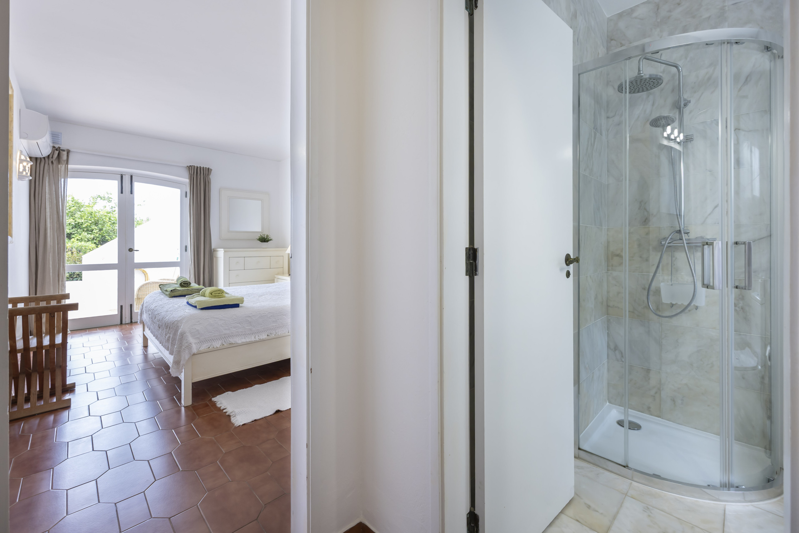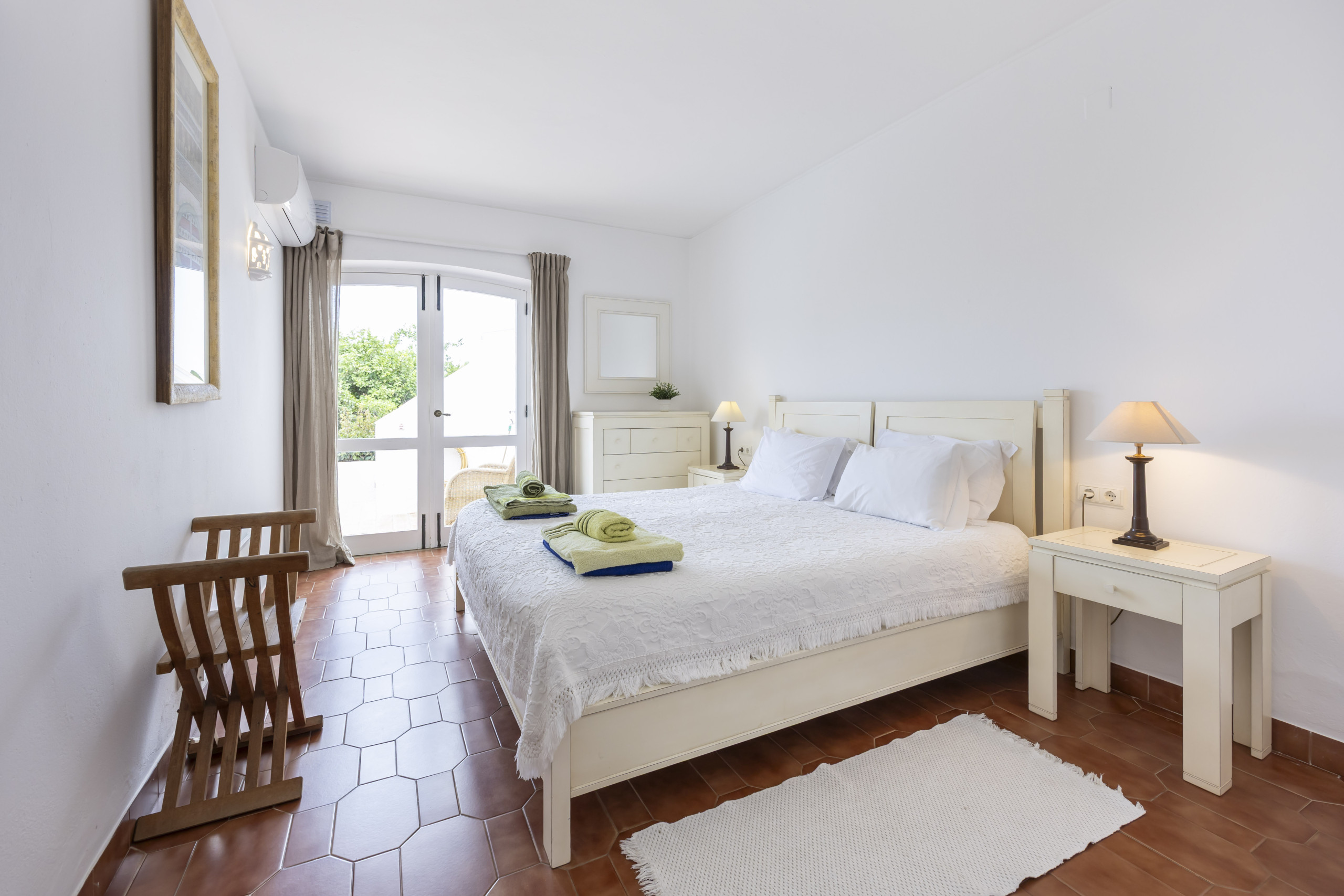 For a max of 6 guests, Ground floor: bedroom 1 with 2 single beds, fitted wardrobe and en-suite shower room, bedroom 2 with super king bed and bedroom 3 with 2 single beds, both with fitted wardrobes and opening onto a balcony with a few steps down to the private and enjoyable patio, surrounded by plants and flowers with gate onto Rua do Poço.