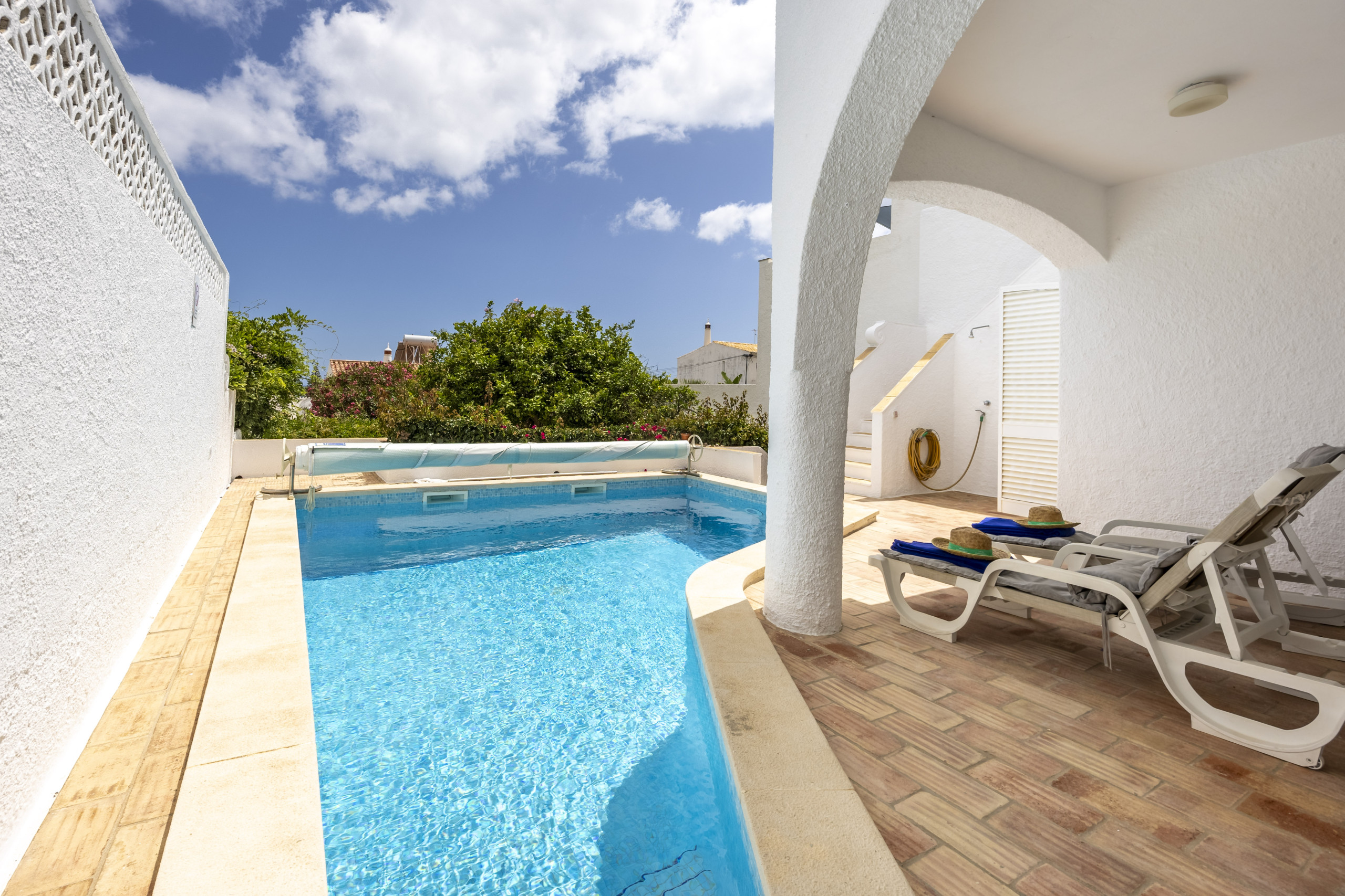 From the terrace, a flight of stairs lead down to the pool area and the terrace below. The pool has a manual cover and can be heated on request at an extra cost. Several sun loungers around the pool area.